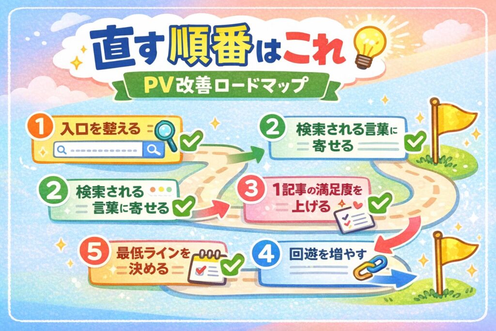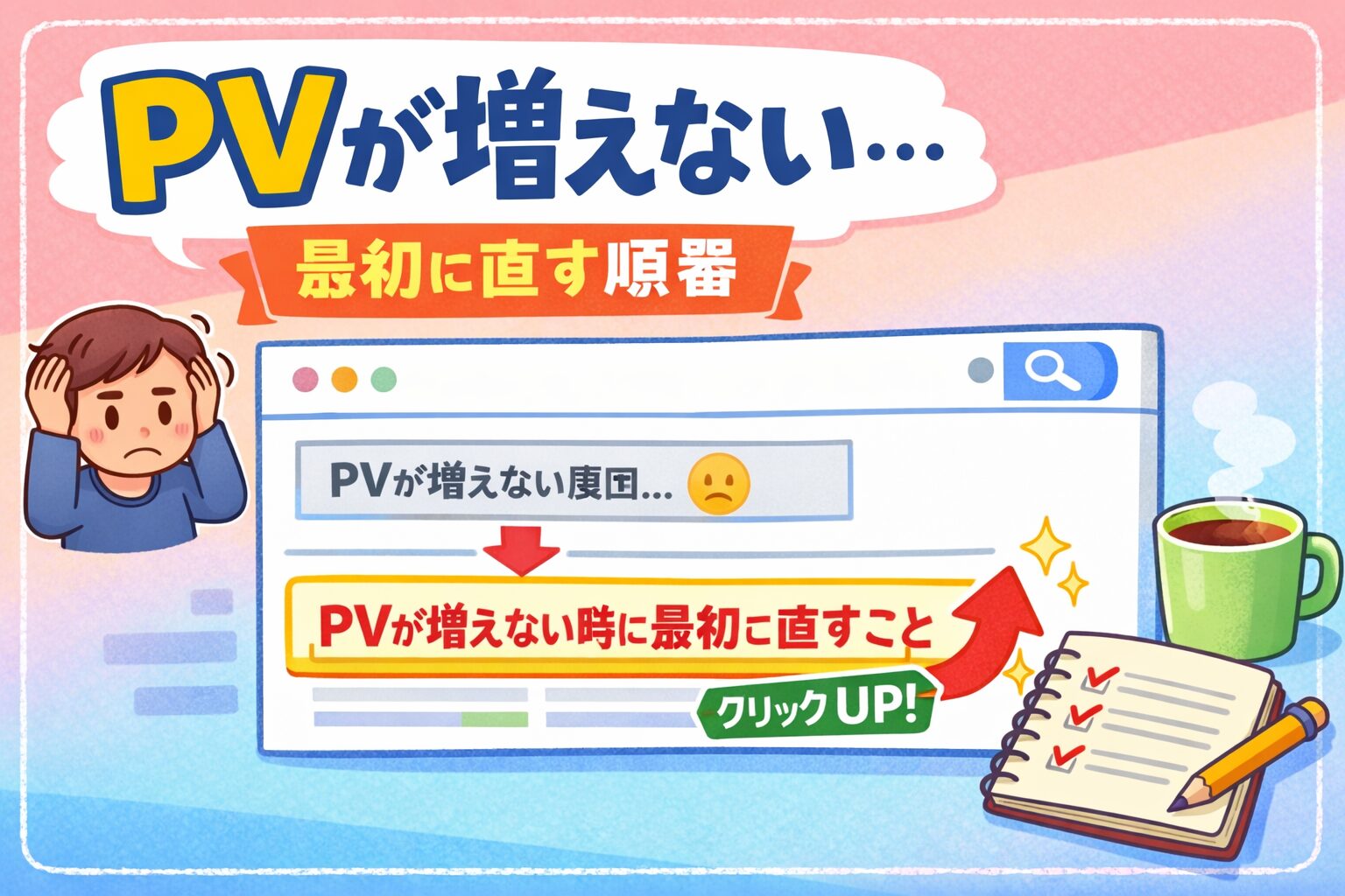 でも大丈夫です。PVが伸びないときは、努力不足よりも「直す順番」がズレているケースがほとんど。この記事では、40代ブログ向けに、まず手を付けるべき最優先の改善順を、迷わないように道順として整理します。読み終える頃には「今日やる1つ」が決まります。