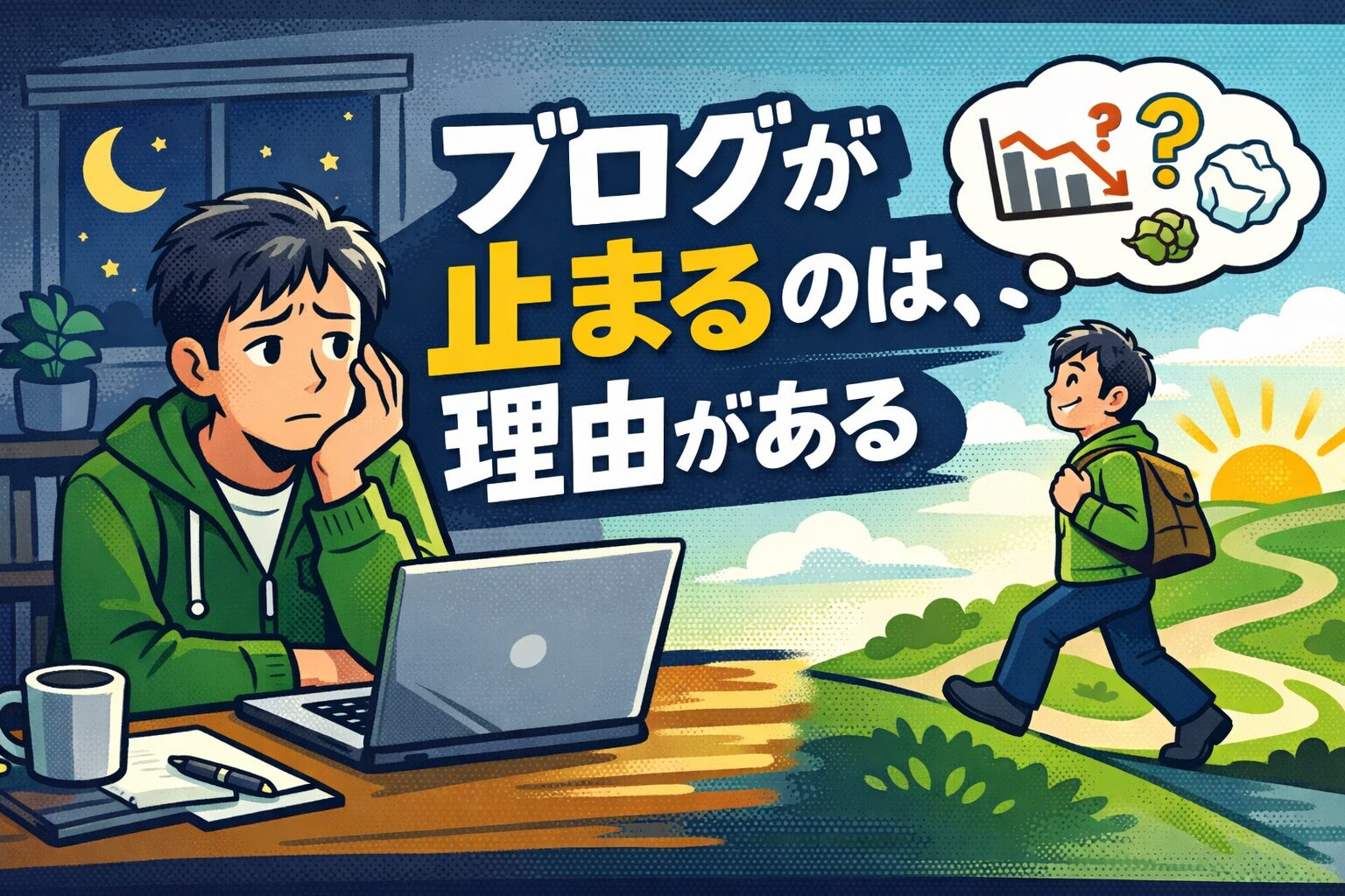 ブログが止まったとき、僕はいつも「もうダメかもしれない」と思っていました。でも今は、止まった経験があるからこそ、続け方を考えるようになったと感じています。止まっても戻ってこれた。それだけで、ブログは続いていると言える。やめなかった自分を、もう少し認めてあげてもいいと思っています。