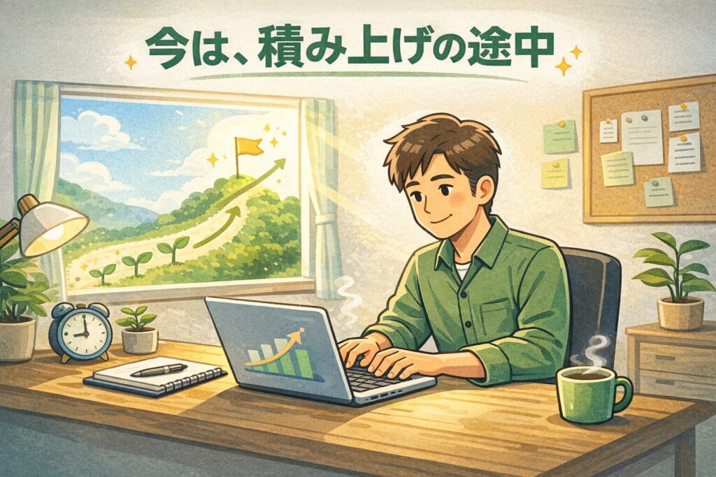 成果が見えない時期に必要なのは、他人との比較ではなく、過去の自分との比較です。書き始めた頃より、文章は整理され、考え方も言葉にできるようになっているはずです。その変化は派手ではありませんが、確実に積み上がっています。