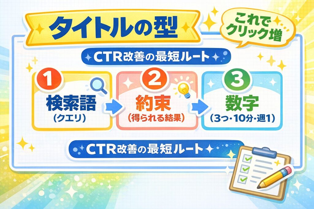タイトルを直すときに迷うのは、「強くしすぎて釣りっぽくなるのは嫌」「でも弱いとクリックされない」というジレンマですよね。ここで使いやすいのが、クリックされる要素を1行にまとめる型です。ポイントは、①具体性(数字や回数)、②読者の得(ベネフィット)、③読者の不安(悩みワード)を入れること。たとえば「週1」「10分」「3ステップ」などの数字は、忙しい40代にとって“できそう”の材料になります。次にベネフィットは「迷わない」「ラクになる」「前兆を拾える」「インデックスが進む」など、読者が得たい結果を言葉にします。そして不安ワードは「伸びない」「不安」「迷子」「インデックスされない」など、今の気持ちを代弁する言葉です。この3つを入れると、検索結果で読者の目が止まりやすくなります。さらにクエリ(検索語)の核になる単語は必ず残します。Search Consoleで上位に出ている言葉が「CTR」「クリック率」「リライト」なら、そのどれかをタイトルに入れるだけでズレが減ります。最後に、タイトルは長くなりすぎると読みにくいので、余計な形容詞を削って“言い切る”。この整え方だけでも、同じ内容の記事が別物に見えるくらい変わります。