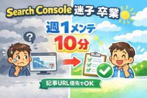 Search Consoleで表示回数やクエリが増え始めた記事は、すでに“伸びる入口”に立っています。ここで全部の記事を直そうとすると疲れて続かないので、まずは当たり記事を1本だけ特定し、CTR(クリック率)に絞って整えるのが次の一手です。表示回数があるのにクリックが少ない場合、原因は本文よりも「タイトルと表示のズレ」であることが多く、上位クエリの核になる言葉を残しつつ、読者が得られる結果をタイトルに入れるだけで反応が変わります。さらに「検索語+約束+数字」の型でタイトルを作ると、忙しい40代でも“できそう”が伝わりやすくなります。加えて、ディスクリプションと冒頭120文字も整えると、検索結果の見え方が一気に強くなり、同じ順位でもクリックが増えることがあります。大きく書き直すより、小さく整えて変化を見る。この週1メンテの型を守るほど、迷いが減り、伸び始めた記事を確実に育てられます。