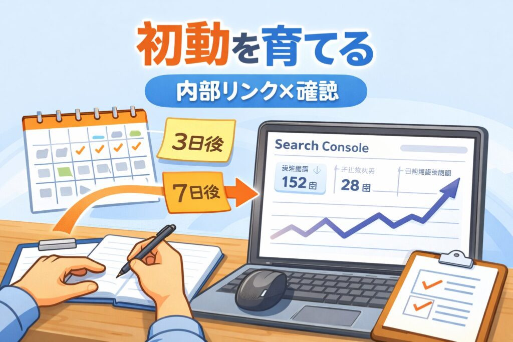 特に見たいのは、リンク元に近い検索クエリで新記事が表示され始めているかどうかです。ここがつながると、内部リンクはただの案内ではなく、新記事の初動を育てる導線になります。焦って何本も足すより、反応を見ながら少しずつ整えるほうが、忙しい日でも判断をより迷いにくく、結果も安定しやすくなります。まずはリンクを貼った3日後と7日後の変化だけを見ると、判断がぶれにくくなります。
